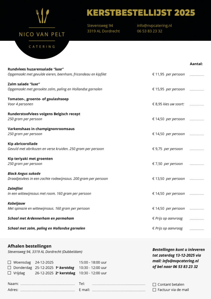 Het kerstbestellijst 2025 kunt u ook in pdf downloaden door op de onderstaande knop te klikken.Gaarne invullen en mailen naar info@nvpcatering.nl of telefonisch doorgeven op 06-53832332.
